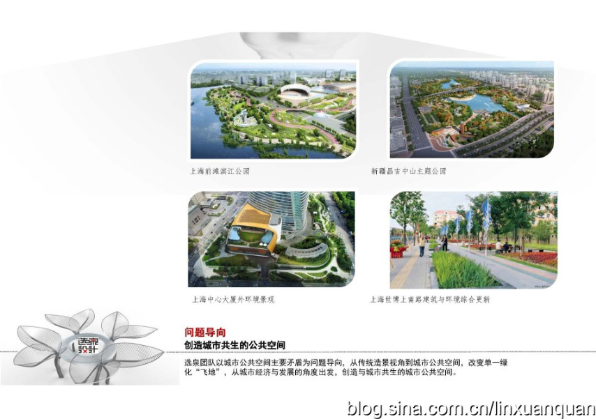 --------上 海 選 泉 設(shè) 計(jì)--------- www.fredshadian.com 400-021-4866 blog.sina.com.cn / linxuanquan 精專小 美 無 為 景 觀 風(fēng)景園林︱景觀設(shè)計(jì)︱ 城市設(shè)計(jì)︱ 城市家具 landscape Architecture Planning and Design Architectural Design Urban Furniture Design 上海世博會(huì) 陸家嘴金融城更新 上海中心大廈外環(huán)境 公共空間總設(shè)計(jì) & 公共街具智造 Email:design@ linoliu.com QQ:2644105441 TEL:86-021-51796296