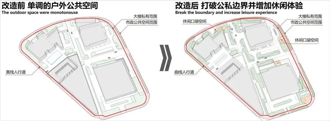 打破市政公共空間與大樓紅線范圍內(nèi)的綠化空間邊界。改變?cè)ㄖ綄俚墓部臻g僅為防護(hù)綠地,和市政公共空間僅為通行功能,通過模糊兩者的邊界,增加公共空間的一些游憩,停留的空間。