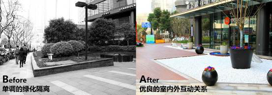 商務(wù)樓的一層一般有接待大廳以及一些休閑接待性質(zhì)的咖啡吧等,并且設(shè)有大型的落地窗,但由于大樓周邊的公共空間主要是一些防護(hù)綠地,導(dǎo)致大樓內(nèi)外的景觀沒有相互呼應(yīng)。