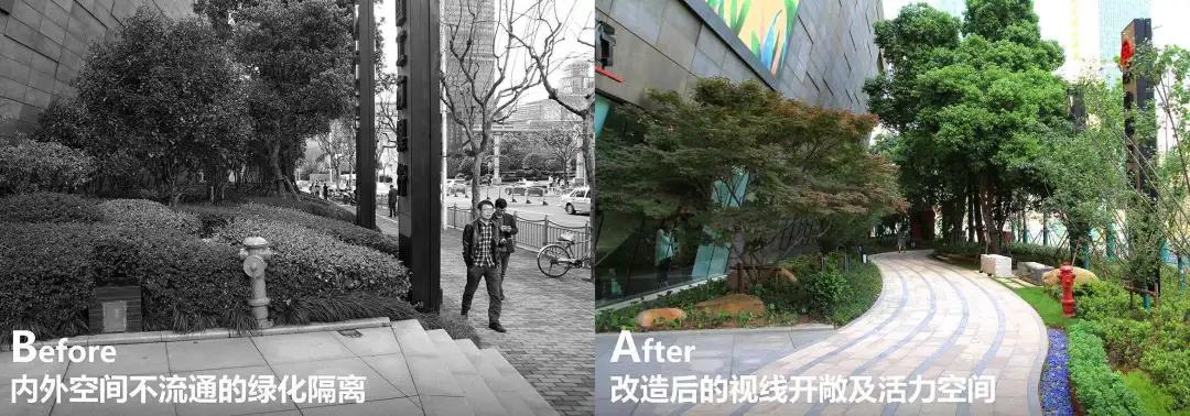 2、同利益方的要求不同。地塊內(nèi)的公共空間是通過地塊共享、集約、置換等方式“擠”出來的,因此方案針對(duì)的業(yè)主就有政府管理部門,大廈物業(yè)方(國企和外資),需要協(xié)調(diào)他們不同的需求,有的希望保持防護(hù)綠化的現(xiàn)狀,安全且便于管理。有的希望方案有所突破,而城市管理部門傾向于后期方便管理和養(yǎng)護(hù)。