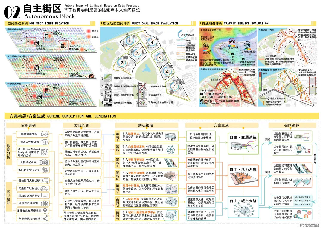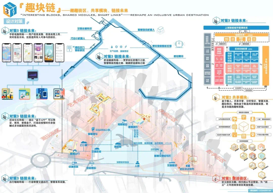 方案設計說明:本方案以基于數(shù)據(jù)實時反饋的自主街區(qū)為主題,通過構建自主交通、自主活力和自主城市大腦三大系統(tǒng),引入膠囊巴士、交通管理系統(tǒng)、智能可變鋪裝、智能活力細胞、底層分時開放、城市大腦和信息共享平臺,以提升該地區(qū)的空間活力;系統(tǒng)的運轉基于場地的時空需求進行實時調(diào)整,進行可持續(xù)的漸進式更新。