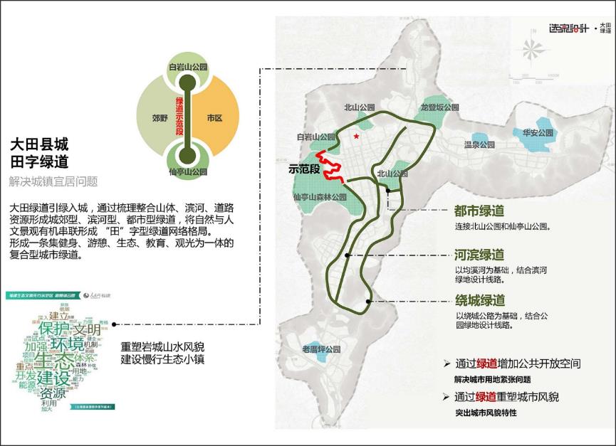 大田縣城依山伴水,遠觀是秀美山城,近觀均溪河穿城而過,但濱水公共空間缺乏,兩側(cè)山巒蜿蜒,但沿城的森林公園可達性欠佳,中間城鎮(zhèn)建筑密布,但可供市民活動的空間稀少。大田縣城綠道的構(gòu)建就是為了在建設(shè)用地緊張的前提下讓城鎮(zhèn)增綠,增加公共開放空間,讓城市變得可以“呼吸”。