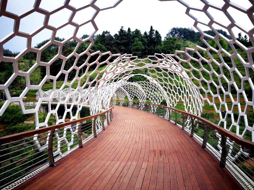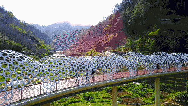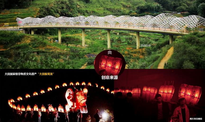 橫跨鳳凰谷80米長的“板凳龍橋”,設(shè)計將大田國家級非物質(zhì)文化遺產(chǎn)“大田板凳龍”的形態(tài)進行抽象