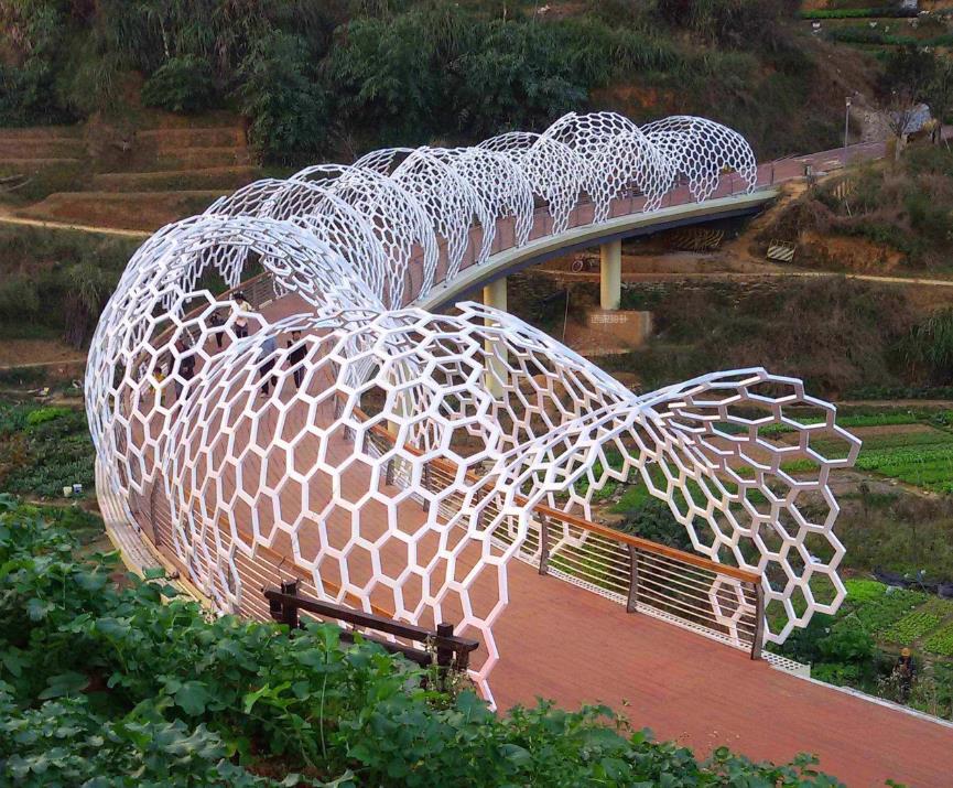 設(shè)計提煉: 5根圓橋墩抽象成“連接把手”,主梁體抽象成“板凳”,橋上的異型雙曲面鋼結(jié)構(gòu)網(wǎng)架抽象成“龍身”,菱形的網(wǎng)架肌理象征板凳龍的竹編表皮,網(wǎng)架端部與綠葉融合抽象成龍尾與龍首,通透的網(wǎng)架表皮“似有非有”傳達了“龍現(xiàn)無形”的意境。設(shè)計摒棄傳統(tǒng)具象的龍的形態(tài)設(shè)計,而是將大田板凳龍的形象抽象并提煉升華,用現(xiàn)代的鋼材料和城市雕塑手法,對大田鄉(xiāng)土建筑進行探索表達。