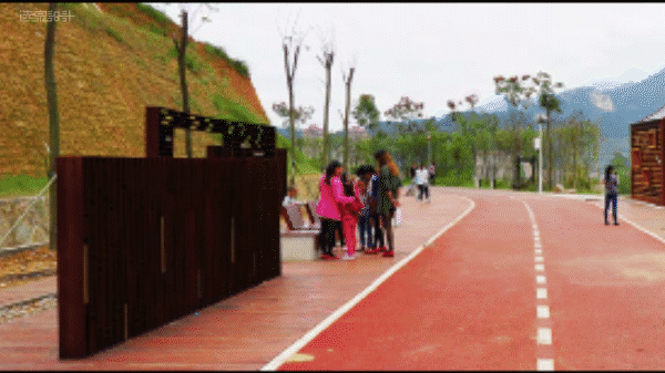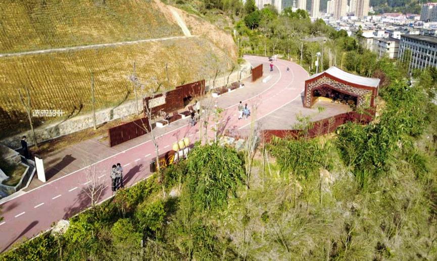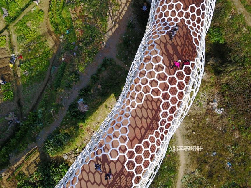 運用健康數(shù)據(jù)結(jié)合沿線 “山水城鎮(zhèn)、梯田山谷、山野林地”的景觀設(shè)置觀景臺和休息驛站。設(shè)計部分,繼承大田本土文化創(chuàng)造了具有地域特色的 “土堡”型的入口驛站、田園風光的“鳳凰谷”、文化遺產(chǎn)的“板凳龍”橋,同時科學設(shè)置了廁所、照明、標識等人性化綠道設(shè)施,沿線綠道新種植130余種近萬株植物,形成一條集健身、游憩、生態(tài)、教育、觀光為一體的復合型城市綠道。