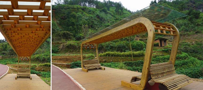 “觀鳳臺”,依山伴坡在綠道兩側(cè)設(shè)置“平地式”休息驛站,是觀賞郊野風光“鳳凰谷”和鄉(xiāng)土文化“板凳龍”橋的最佳觀景點。