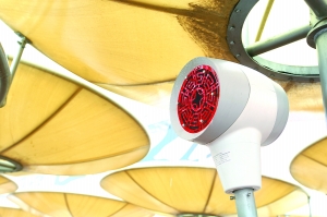 ??記者在園區(qū)內(nèi)看到很多白色半圓形球體,上面罩著寫著中國篆字的紅色網(wǎng)格,它們懸掛的位置比路燈稍低,看起來像個裝飾品。林選泉告訴記者,這是一種噴霧降溫設(shè)施,造型的靈感來源于“中國娃娃”。天熱的時候,它們會噴出低溫水霧,令周圍的小環(huán)境降溫5至6攝氏度。