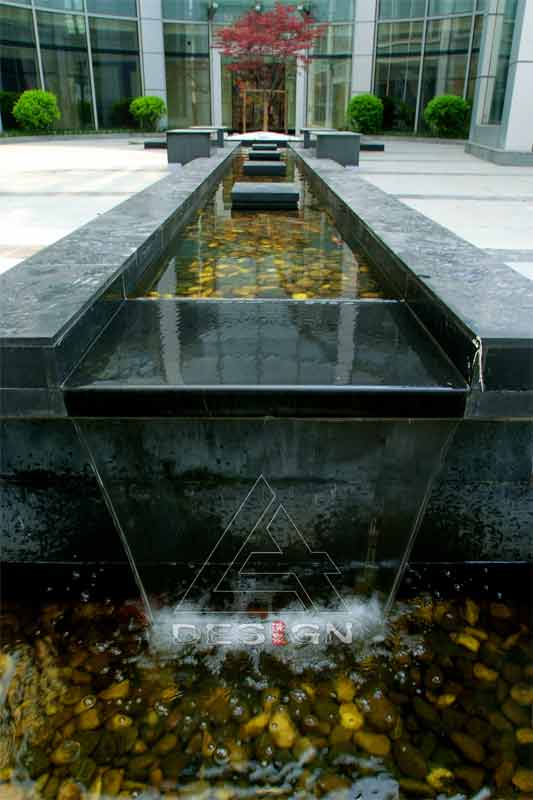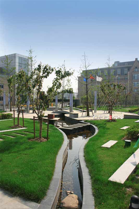 該項目在有限的空間環(huán)境中通過各種造園手法——入口成排的剛竹、弧形的景墻、蜿蜒的小溪、筆直的水槽、錯落的跌水、精致的小橋、方圓組合的綠地與休閑平臺等,形成了既有開放的動空間,又有內(nèi)聚的靜空間,使整體環(huán)境在融入周圍現(xiàn)代建筑的同時又有傳統(tǒng)的意境之美。