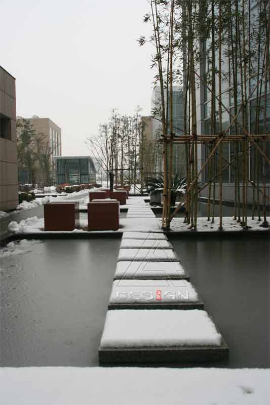 planted, which suggests elegance and tranquillity. Ting-steps built in water, planting pools and rest platforms extending towards to water and small red square stools on the recreation platforms provide a small flexible space, so you can sit close by a window of office to enjoy the peaceful moment lonely of the afternoon. The breeze passes through the bamboo forest to blow small wavelets beside the pebbles. Because of the water, the space is parted but not separated; voices keep a distance while people converse and walk outside the window, and fish move freely in water, so the site has natural delight at that moment.