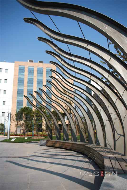 down to a small rest space which is formed by enclosing an arch-closed wisteria steel gallery and adopts the fountain as centre. The space extends by linear eastwest roads in the east-west and south, and the space is orderly divided, so we can distinguish big one from small one and see the exquisite rich landscape.