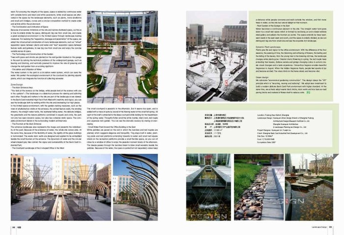 “You look at the scenery on the bridge, while people look at the scenery with you in the upstairs”—The landscape is a dialectical process for viewing and admiring each other. People and matters in the site are part of the landscape or are viewed. In the Bank Card Industrial High-Tech Park filled with creativity and vigour, you can see the landscape both by walking within the site and overseeing it at high places. In the limited space environment, with the garden-making measures, such as the rows of phyllostachys viridis at the entrance, the arched feature walls, the winding streams, the straight water tanks, the scattered falling water, the delicate bridges, the greenbelts and the leisure platforms combined in square and circle, the park not only has open dynamic space, but also has cohesive static space. The complete environment blends in the surrounding modern architectures.