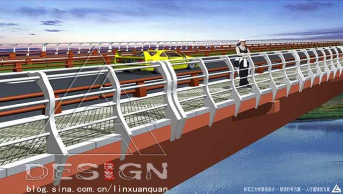 欄桿是用來保障行人或車輛行駛安全、防止墜落或沖撞一種必備的安全設(shè)施,也是與行人最接近的部分,其造型及色彩設(shè)計影響著橋梁的整體景觀。欄桿色彩一般采用溫和亮麗的色,具有易識別記憶和防撞的警示作用,要與橋梁總體造型相統(tǒng)一,與周圍環(huán)境相協(xié)調(diào),要體現(xiàn)欄桿的連續(xù)和韻律感,增強(qiáng)橋梁連續(xù)和流暢感.