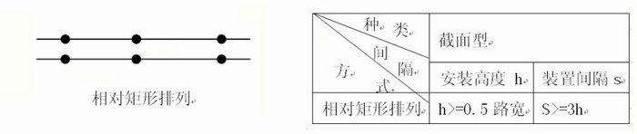 (1)一側(cè)排列?? (2)交錯(cuò)排列? (3) 相對(duì)矩形排列? (4) 中央懸掛配列? (5) 中央分離帶布置方式.