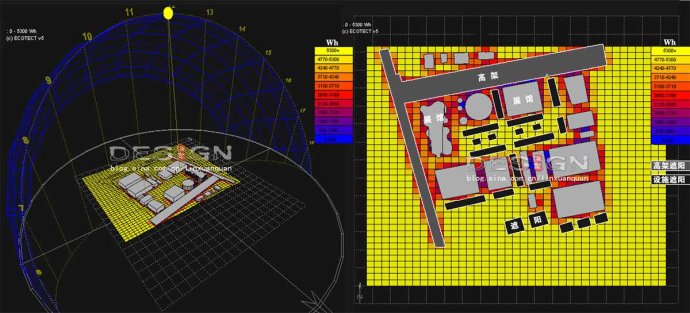 首先是遮哪里,主要是基于對場地的人流流線的分析:以東西向高架平臺為主,南北向高架及樓梯出口以及園區(qū)公交形成的南北向人流為輔呈魚骨狀,遮蔭布局形式結合人流走向形成線性網狀的遮蔭體系,其中高架平臺形成東西向的主廊道,縱橫向設置次廊道。同時通過道路行人流量及各地塊展館的冷熱程度的預測,結合園區(qū)各個地塊的人流量,遮陽設施位置應結合地塊空間的不同情況靈活調整。最后,借助ECOTECT、TANGENT軟件對夏季日9:00(AM)—16:00(PM)日照陰影分析以及場地太陽輻射分析,得出場地一些南北向廣場可以利用展館間的陰影區(qū)來遮蔭的結論,對遮蔭體系內需設立的遮陽設施進行精確定位。值得說明的是結合場地人流形成的網狀遮蔭體系在對場地人流的引導有著積極作用(如圖14)。