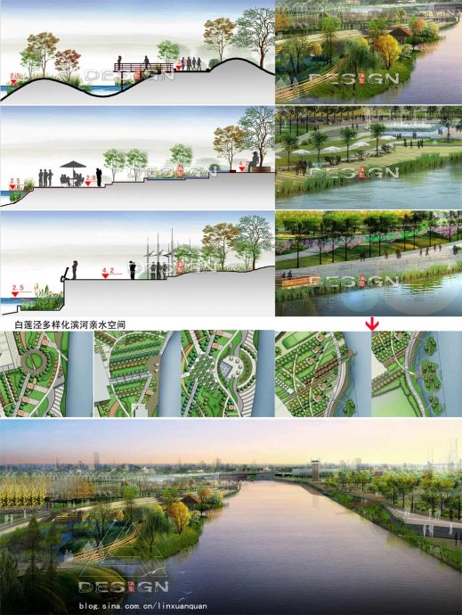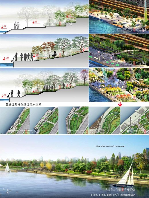 (3)waterfront walkway: set the +4.00 meter wide waterfront walkway at the elevation of +4.70 meter in the highest navigable water level and make it interpenetrate the entire waterfront area.