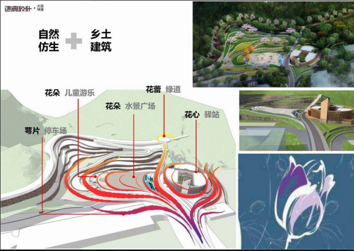 運(yùn)用自然仿生手法使綠道驛站形似山谷里盛開(kāi)的花朵,