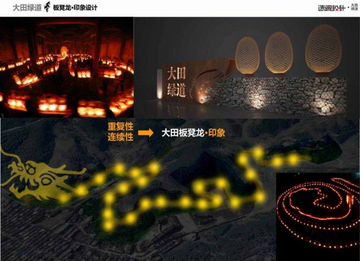 綠道兩側(cè)與節(jié)點(diǎn)綠化、板凳龍步行橋、綠道出入口廣場(chǎng)、土堡文化的服務(wù)驛站、3個(gè)觀景平臺(tái)與驛站、板凳龍小品、標(biāo)識(shí)系統(tǒng)、夜景照明、座椅等配套設(shè)施。