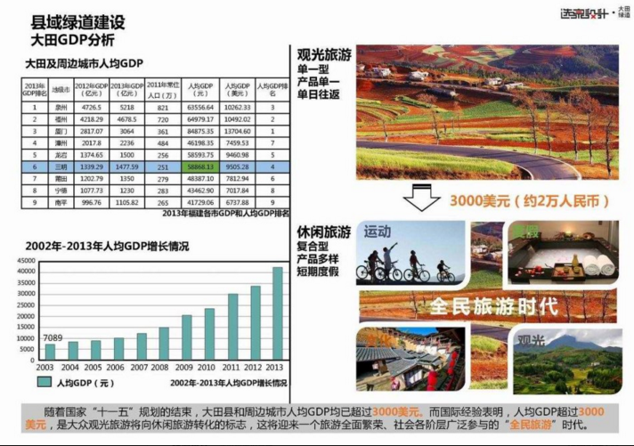 隨著國(guó)家“十一五”規(guī)劃的結(jié)束,大田縣和周邊城市人均GDP均已超過(guò)3000美元。而國(guó)際經(jīng)驗(yàn)表明,人均GDP超過(guò)3000美元,是大眾觀光旅游將向休閑旅游轉(zhuǎn)化的標(biāo)志,這將迎來(lái)一個(gè)旅游全面繁榮、社會(huì)各階層廣泛參與的“全民旅游”時(shí)代。