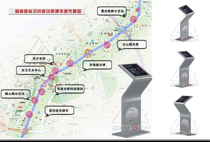 確定后的楊高路標(biāo)識(shí)運(yùn)用在道路附屬設(shè)施體系、戶外廣告等景觀元素中,如道路隔離欄、人行道鋪裝、路指示牌、垃圾箱等。在楊高路人流大的(易初蓮花、東方藝術(shù)中心、進(jìn)才中學(xué)等)的重要節(jié)點(diǎn)設(shè)立“楊高路標(biāo)識(shí)創(chuàng)意說明牌”,讓城市大眾解讀楊高路標(biāo)識(shí)的文化與含意,在詮釋中加深楊高路道路文化的認(rèn)同。