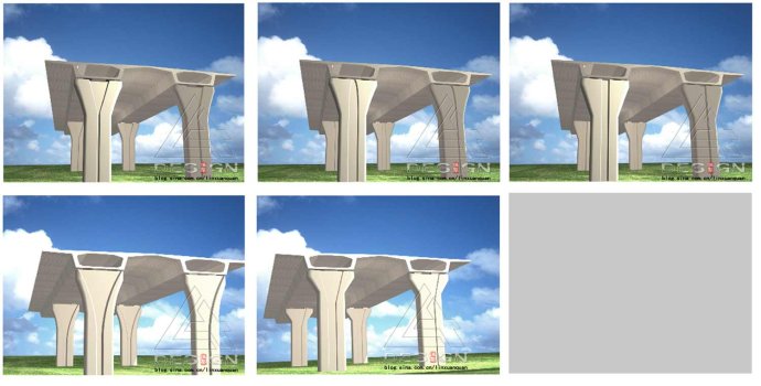 松花江大橋引橋橋墩材料以混凝土為主材料,具有可塑性,其形態(tài)設(shè)計(jì)自由度大。在原設(shè)計(jì)的帶凹槽Y形橋墩的造型基礎(chǔ)上, 考慮了橋墩立體形態(tài)的虛實(shí)、剛?cè)?、凹凸及光影變化,運(yùn)用計(jì)算機(jī)“虛擬真實(shí)”技術(shù)引申設(shè)計(jì)出了一系列Y形橋墩。(圖10 為松花江大橋橋墩造型景觀設(shè)計(jì)部分方案)